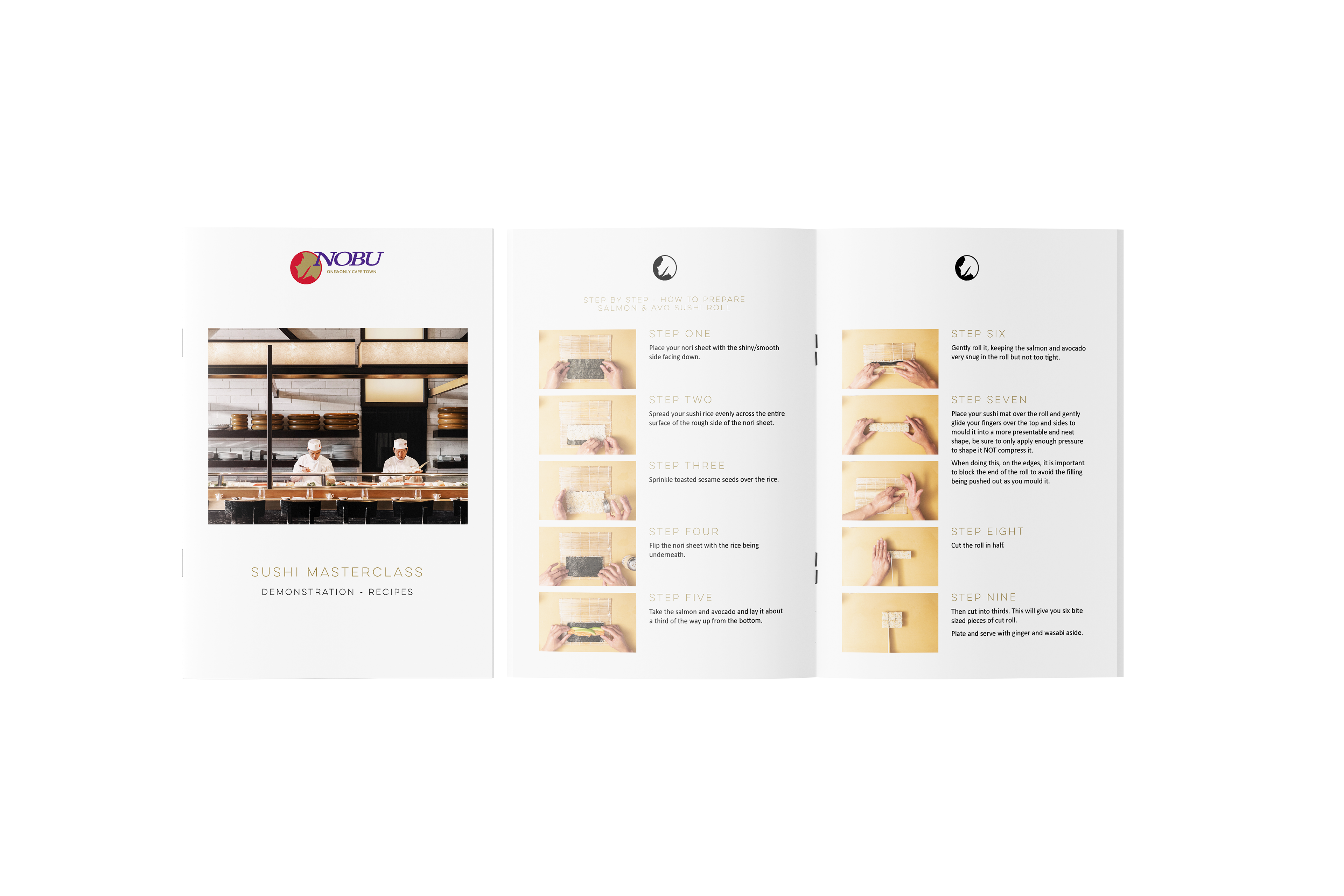 Poster promoting an offer and sushi-making booklet providing guides and recipes.